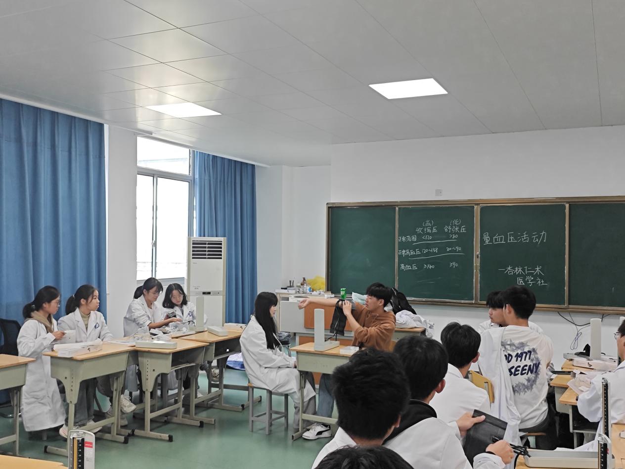 在临床诊疗过程中,血压测量是非常重要的检查方法。为了提高临床医学专业大一新生的学习兴趣,2024年11月13日,杏林仁术医学社组织社团成员30人在医学楼405实训室开展血压测量技能操作。