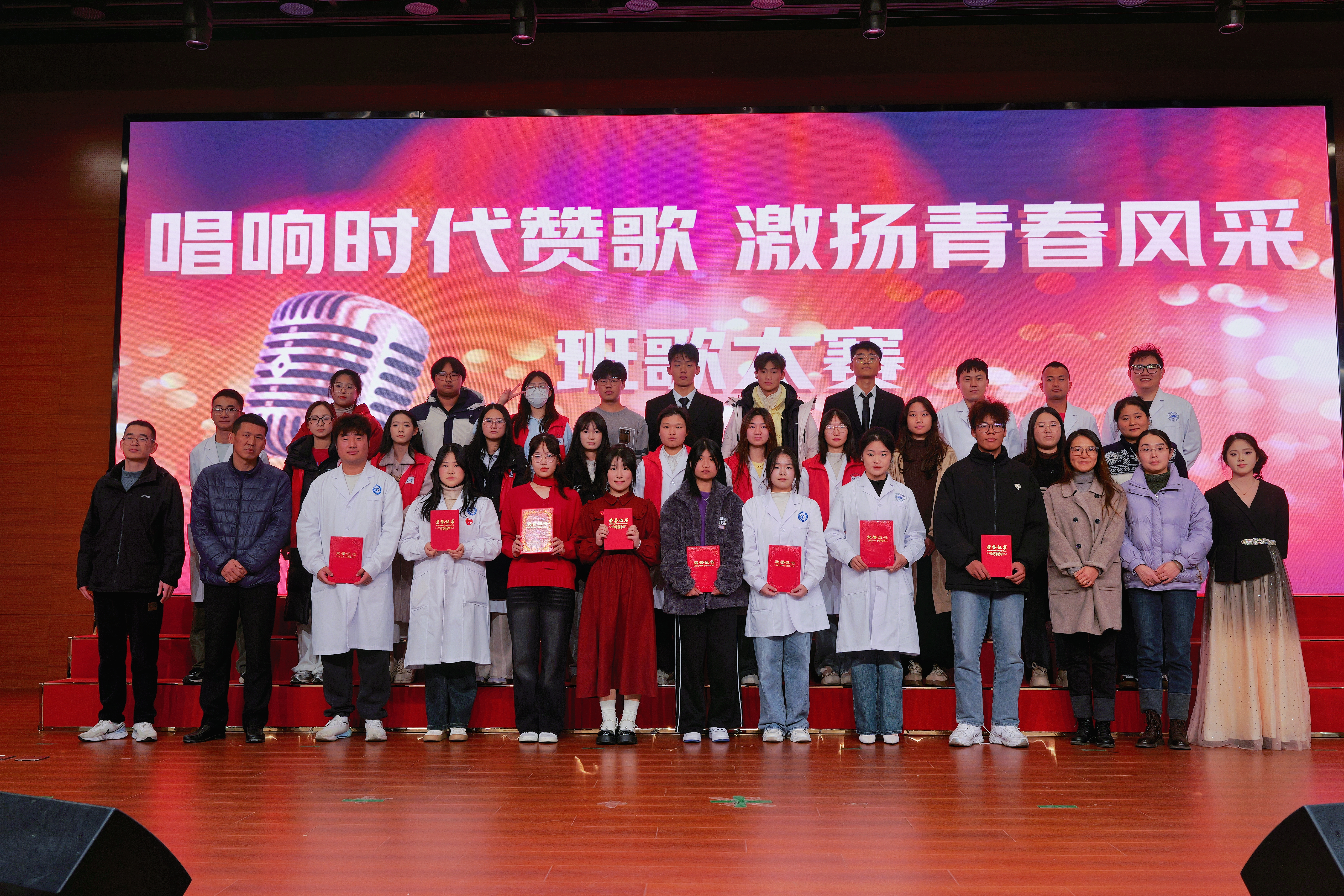 比赛现场,各参赛队伍激情演绎,唱响最美好的青春、最光明的未来,同学们在舞台上大放异彩,展现了青春的活力。串场节目和现场互动也掀起阵阵热潮。最终,24运动康复班获得本次比赛一等奖;24护理6班、24医检2班获得二等奖;24护理2班、24老服班、24康复2班获得三等奖;24护理3班、24康复1班、24临床1班、24预防班获优秀奖;经过线上投票,24医检2班获得最佳人气奖。