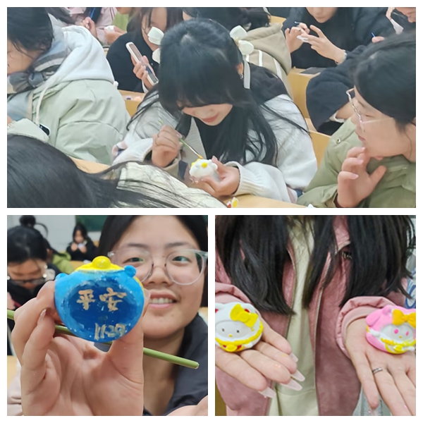 活动中每位同学手持画笔,专注认真地创作属于自己的石膏娃娃。五彩斑斓的颜料将原本单调的白色娃娃变得生动而有趣,让每个娃娃都充满了个性,仿佛有了自己的灵魂。通过亲手绘制这些可爱的娃娃,同学们不仅体验到了创作的乐趣,还在这个过程中提升了自己的动手能力和专注力。本次活动的一个亮点是作品的赠送和交换活动,同学们用彩纸留下祝福赠言,分享大学的心得与感悟,彼此鼓励、共同进步,加深了彼此之间的友谊和感情。