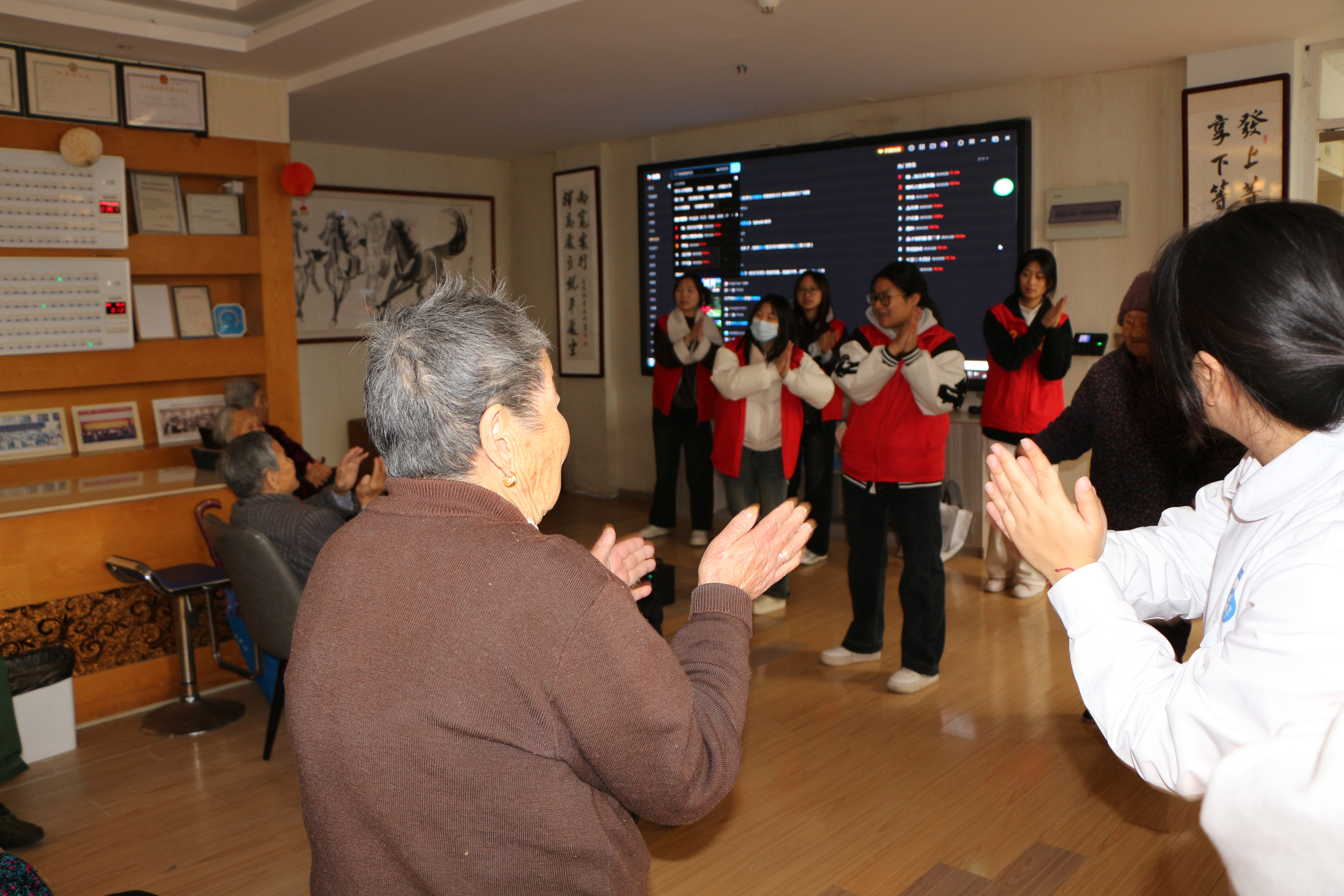 活动现场,老师和学生志愿者们充分发挥专业优势,为老人们提供细致周到的健康服务。他们耐心细致地为老人们测量血压,认真记录数据,并结合测量结果,用通俗易懂的语言提供个性化的健康咨询,叮嘱老人们注意饮食、合理运动,帮助他们了解自身健康状况,提高健康保健意识。除了健康服务,很多志愿者们还和老人们亲切谈心互动,那份温馨的场景,就像和自己的爷爷奶奶一样。最后还精心编排了文艺节目,一首首经典红歌唤起长者的时代记忆,青春洋溢的舞蹈点燃现场气氛,而手指操教学则通过趣味互动帮助老人锻炼手脑协调能力,现场气氛温馨而热烈。长达两个多小时的活动结束时,老人们和同学们恋恋不舍的场景让人泪目而温馨。