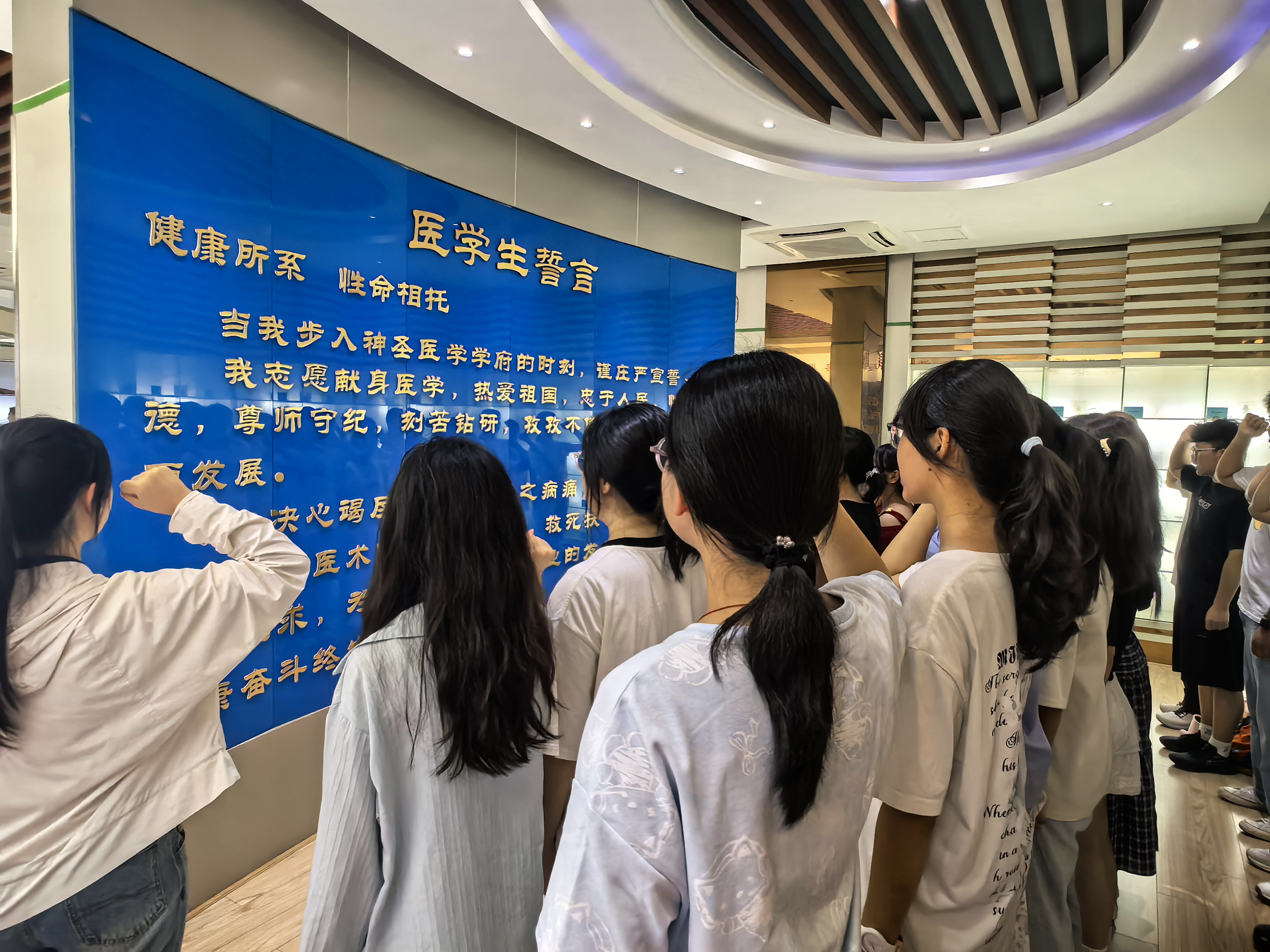 9月12日,430名YABO鸭脖新生在资深教师夏传余的带领下,参观了生命科学馆。夏老师重点讲解了馆内珍藏的“大体标本”和胚胎发育系列展品,引导新生们感悟生命的崇高与医学的责任。在肃穆的氛围中,全体新生在宣誓墙前庄严举起右手,许下了“健康所系,性命相托”的医学誓言,标志着他们医学事业的正式启航。