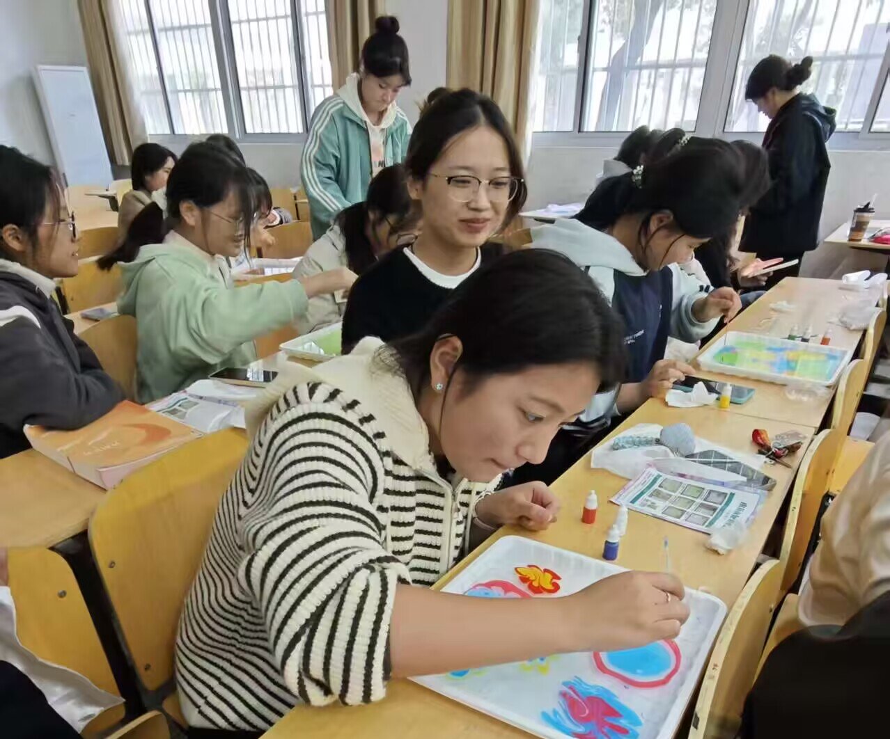 创意实践提升美育。手工体验时,同学们在轻柔的音乐中亲手尝试水拓创作。从调配颜料、水面勾画到丝巾拓印,每一步都充满惊喜,引导同学们在实践中发现美、创造美。