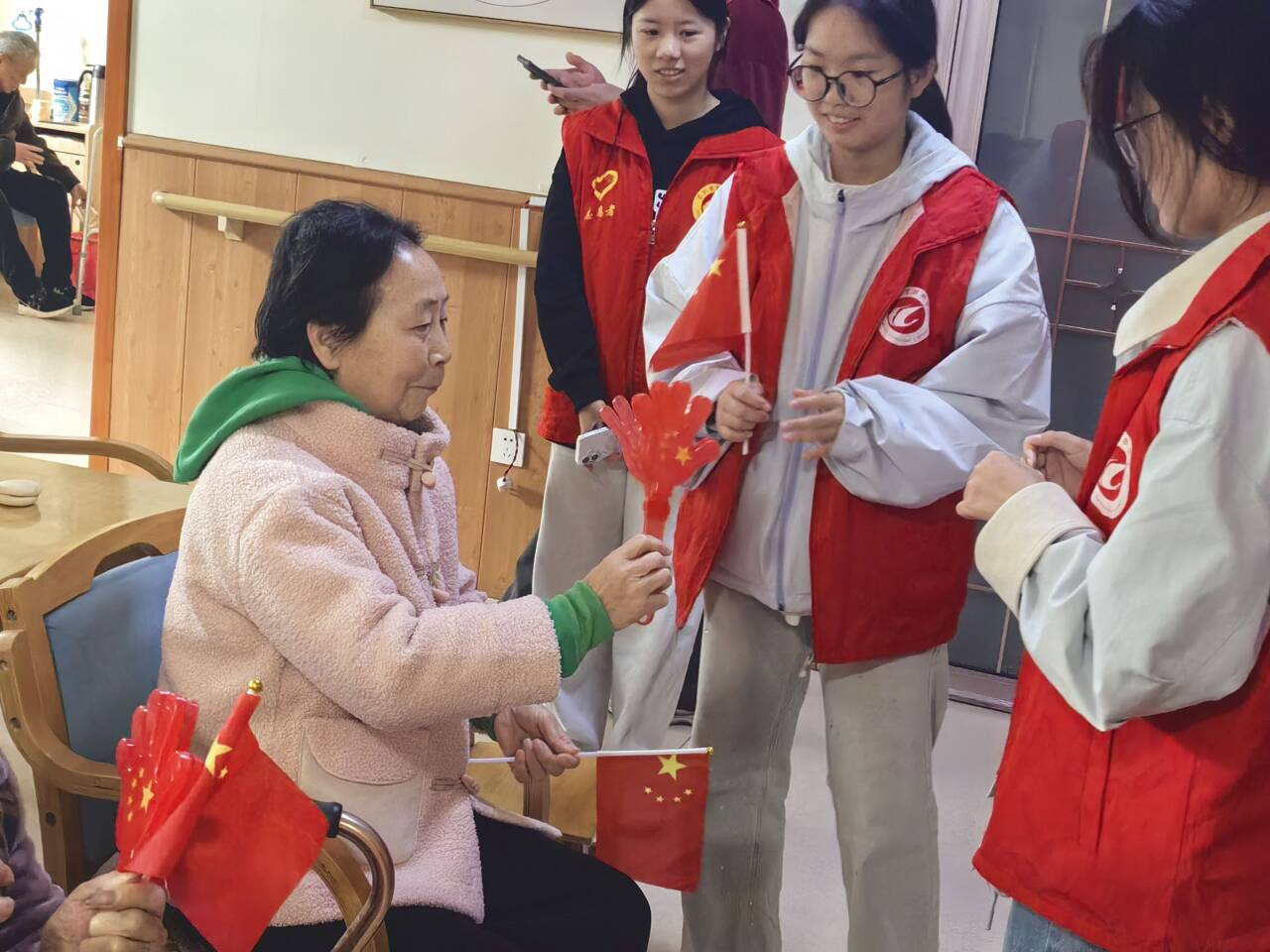 在几天前的红歌大赛中获奖选手们,为老人们带来了红歌串烧:《东方红》、《我爱北京天安门》、《歌唱祖国》、《没有共产党就没有新中国》.......熟悉的旋律在养老院活动室响起时,老人们的脸上洋溢出幸福的笑容。不少老人情不自禁地跟着哼唱,现场气氛温馨而感人。红歌在养老院志愿服务中扮演着不可替代的角色,它是打开老人心扉的钥匙,也是连接不同时代的纽带。当铿锵有力的红色旋律与老人们布满皱纹却充满激情的和声交织在一起,代际之间的距离瞬间消弭,只剩下音乐的共鸣和情感的流动。