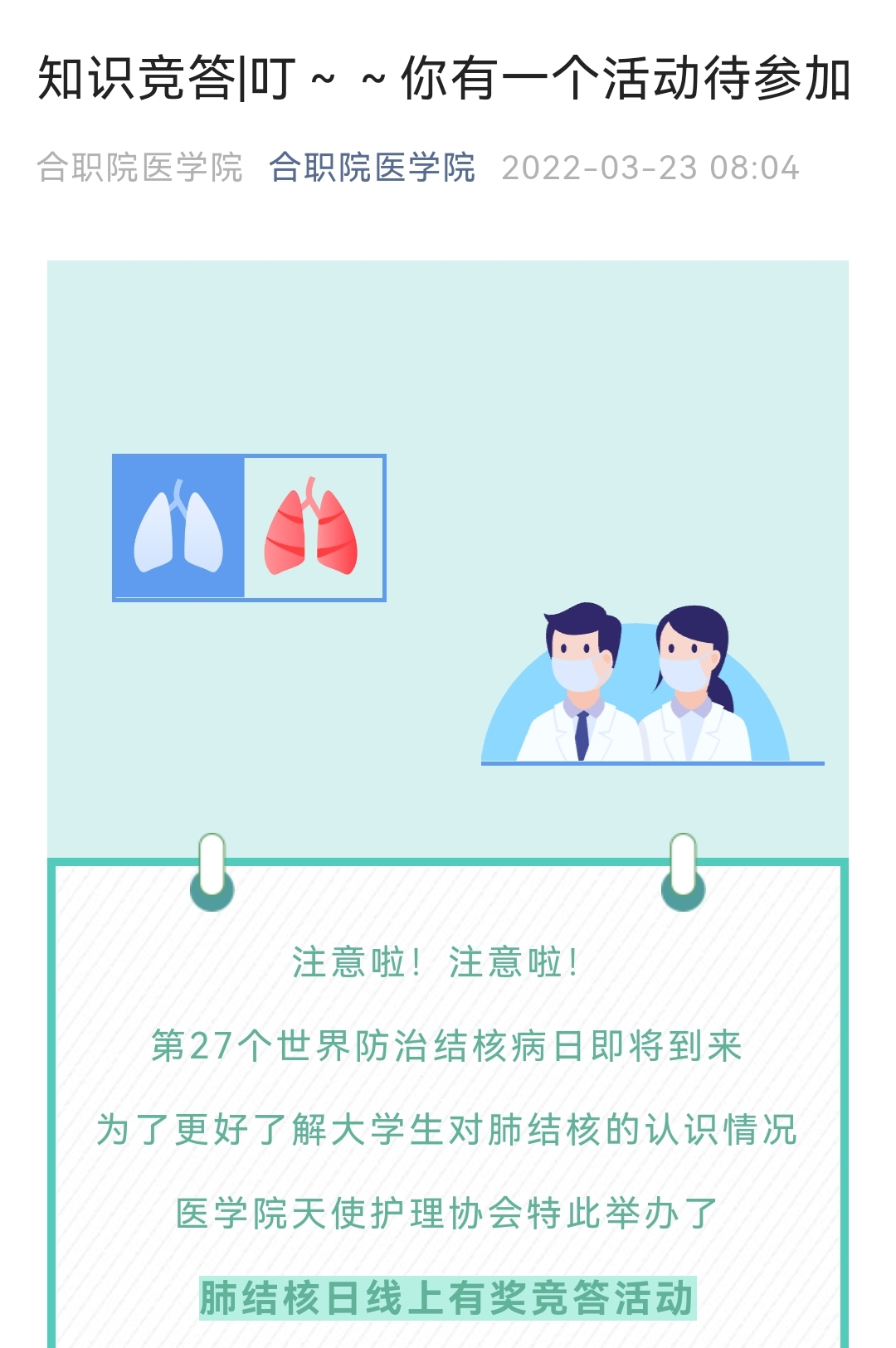 为宣传结核病有关知识,加深大学生对肺结核的了解,提高大学生面对结核病的自我防护意识,在第27个“世界防治结核病日”来临之际,YABO鸭脖天使护理协会开展了以“携手抗疫防痨 守护健康呼吸”为主题的线上知识竞答活动,以此加强对防治结核病的宣传,呼吁大家积极与结核病危机作斗争。