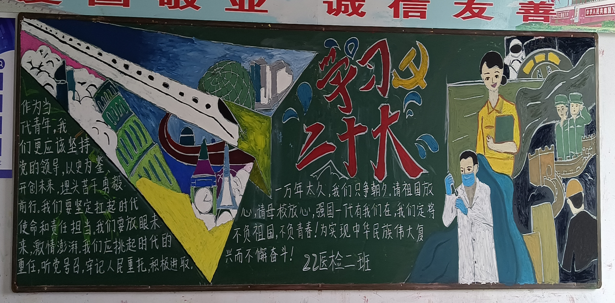 本次主题活动主要由三部分组成。一是以板报设计为重点的班级宣传阵地建设。二是班级团支书讲团课,解读关于党的二十大重要内容,宣讲二十大精神,使全体成员深入学习了解党的一系列新的理论成果。三是组织学生观看红色影片,引导支部成员筑牢信仰,稳扎思想根蒂,砥砺青春心向党,志存高远向未来。部分班级创新活动形式,通过设计“二十大”知识竞答引导同学们深刻理解二十大精神,深入开展讨论学习,增强支部活动的趣味性和同学们参与的积极性。