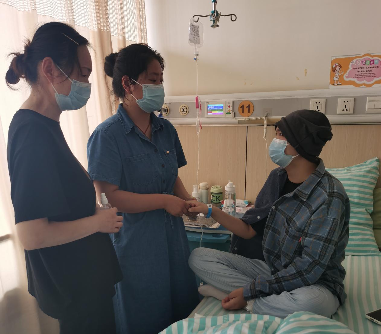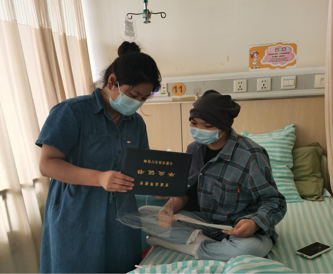 经过第一阶段的化疗,病床上的魏雨晨显得十分虚弱,却在看到老师到来的那一刻既开心又激动,尤其是看到老师带来的毕业证书,立马就打开看起来。由于病房环境的卫生要求,这次看望没有拥抱,魏雨晨拉着孙老师的手告诉她,自己一定会积极接受治疗,以积极乐观的心态战胜病魔。作为辅导员,孙亚萍告知她如何办理本科录取学校学籍保留,鼓励她在康复后回到学校继续学业。同时,孙亚萍将学校、学院领导、老师们和同学们的关心与鼓励带给魏雨晨及家人,叮嘱魏父魏母照顾孩子的同时注意自己的身体。