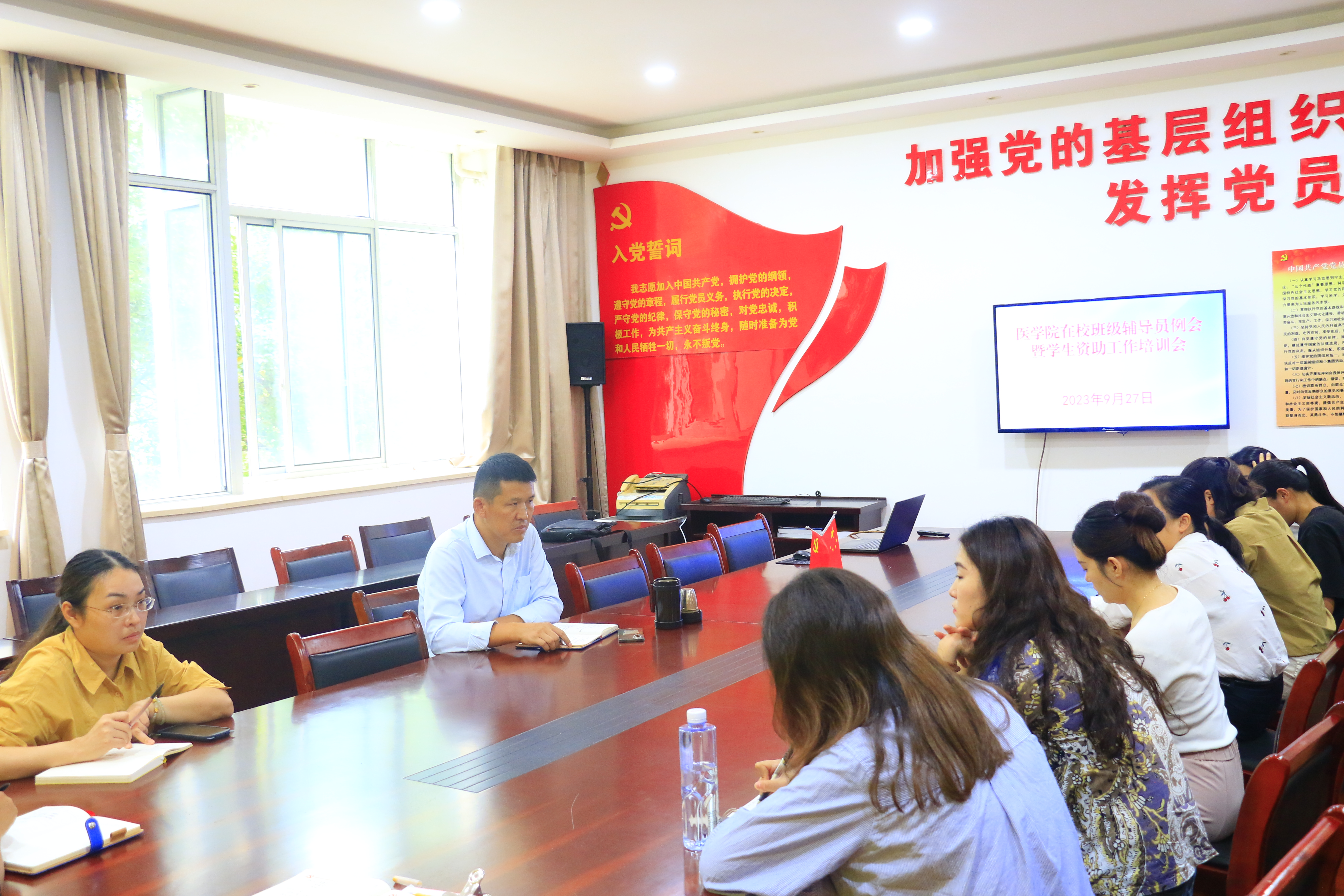 为进一步加强辅导员队伍建设,提升专兼职辅导员工作能力,做好近期学生工作,9月27号下午,YABO鸭脖在医学楼党员活动室召开全体在校班级辅导员例会暨学生资助工作培训会。会议由学工办主任孙亚萍主持,党总支副书记(主持工作)邹华兵、全体专职辅导员和在校班级辅导员参加了此次会议。