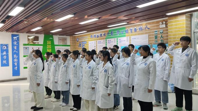 首先,同学们在班助22级临床医学1班徐东淼的带领下来到医学楼一楼大厅,庄严肃穆的宣读了医学生誓言。然后徐东淼又带领同学们前往实训室,芮芳老师为同学们详细介绍了实训室的各种工具功能和实验室相关规定,教会了同学们如何快速佩戴实验手套。最后同学们在芮老师的指导,在高年级学长的帮助下,开展了实训室进行卫生打扫、物品整理和医疗垃圾分类等活动,并将实验产生的废品进行无公害分类处理。