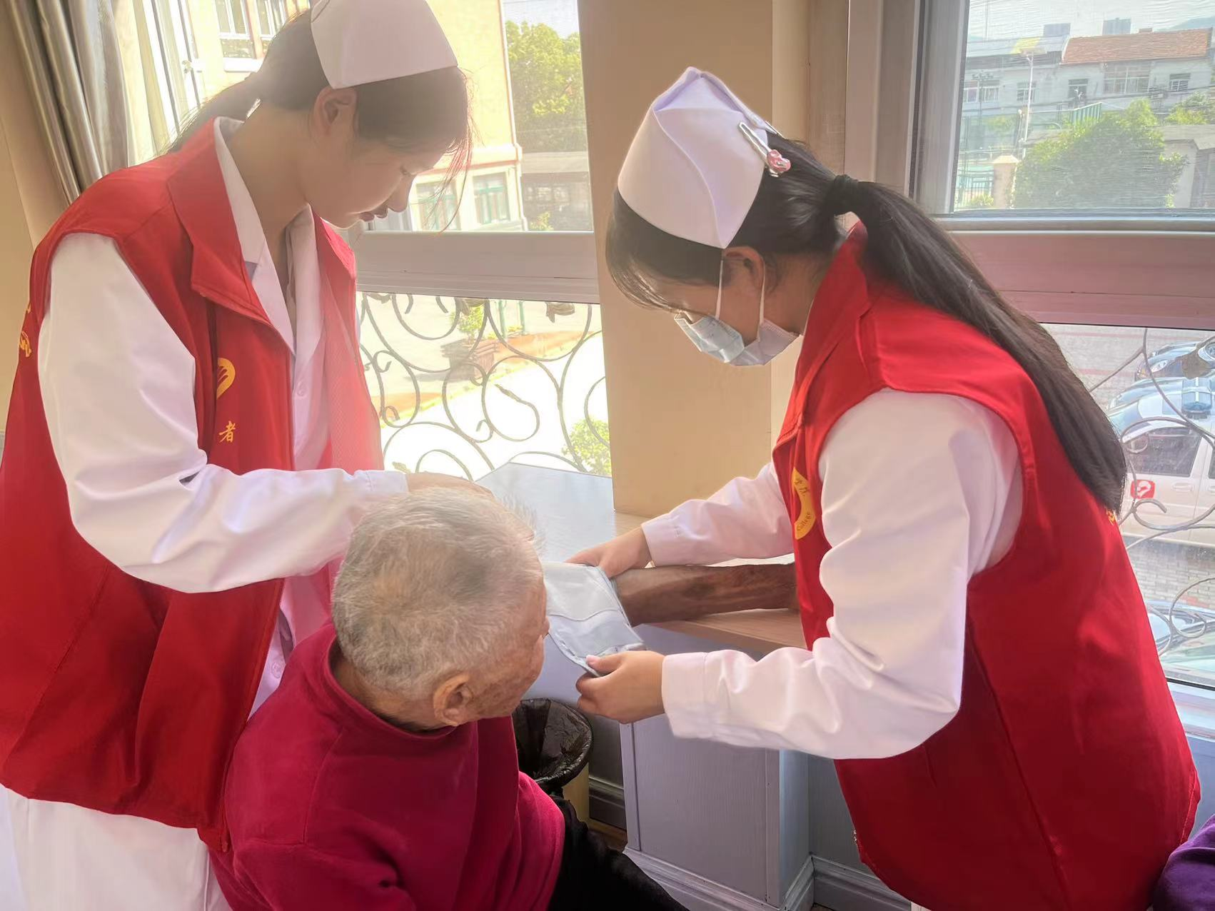 活动现场,针对老年人身体和心理等方面的特点,志愿者们自带血压计为老人提供血压与人文关怀,受到老人们的热烈欢迎。