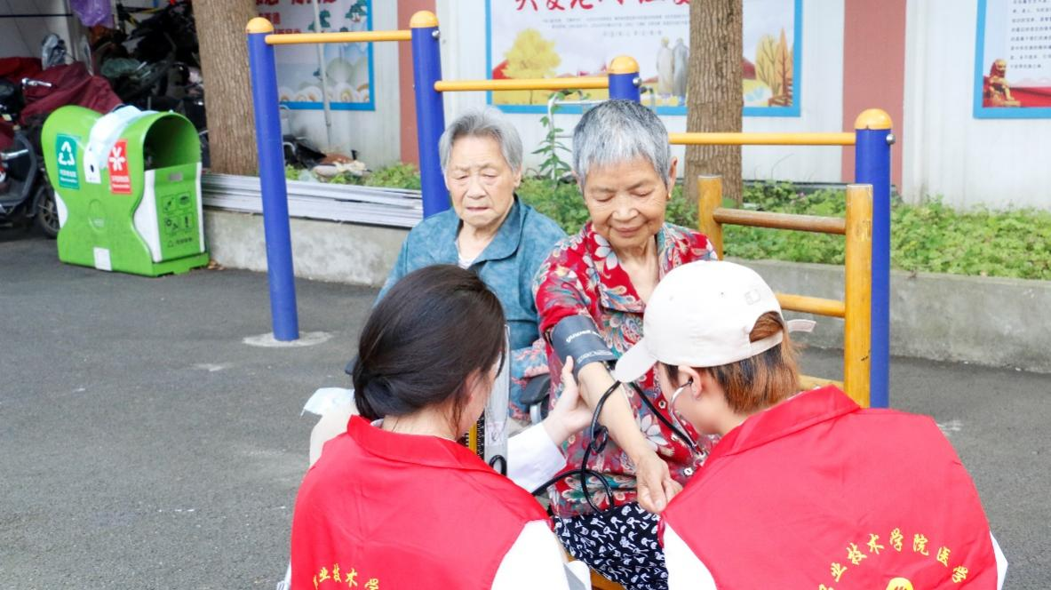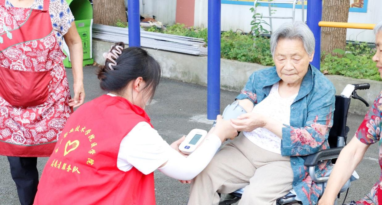 在活动中,学生志愿者们耐心细致的为老人们测量血压,同时为老人们解答有关高血压方面的问题,为他们普及健康知识,提醒老人们注意饮食安全等。
