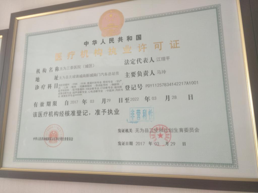 无为三泰医院市一所民办综合性医院,拥有泉塘和县城两家医院,是全县城镇职工、居民医疗保险和民政局慈善公益活动定点医院。