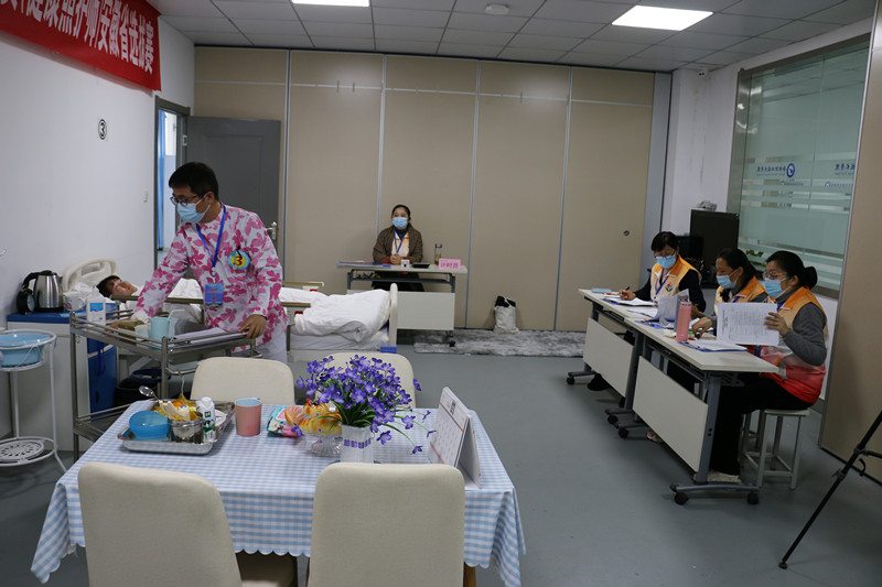按照全国赛选拔标准要求,本次选拔赛采用理论考核融入实际操作技能考核方式,健康照护重点考核参赛选手的文字表达能力、动手操作能力、沟通交流能力。其中,文字表达能力通过书写护理文书来考核,动手操作和沟通交流能力融合在照护实践中。场景式实操竞赛主要通过给予的案例描述,要求选手在指定的场景中,利用现有的资源,由标准化病人配合,完成规定的任务,为照护对象提供自主和独立的健康照护。