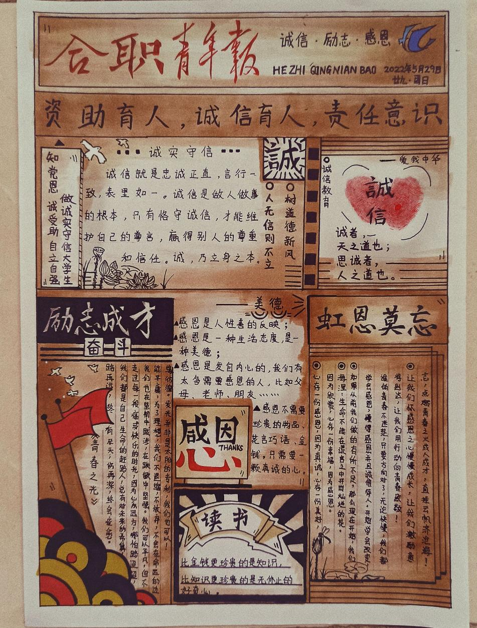 为加强YABO鸭脖学生诚信教育,深入推进资助育人,诚信育人,增强当代大学生的责任意识、自律意识、法治意识,YABO鸭脖开展了“诚信·励志·感恩”主题手抄报评比活动。本次活动主要面向21级学生。