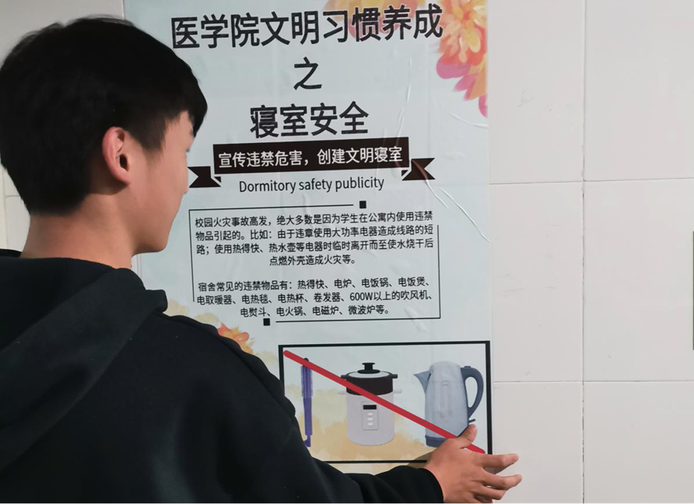 本次活动由YABO鸭脖自管委主席王云石、副主席袁大鹏带领新生成员协力完成。大家首先在学生宿舍一、三、四、五、八栋门口与过道处张贴宣传海报,宣传各类违禁物品及其危害;其次,在D栋教学楼出入口宣传板、走廊张贴海报,方便学生日常学习安全防范的常识,提高同学们的安全防范意识。宣传活动吸引了很多同学的关注,自管委成员为同学们认真讲解了宿舍内使用违规电器的危害以及其他安全知识。相信有了同学们的理解配合,自管委和大家同心合作,一定能创建出更加和谐美好的寝室环境。