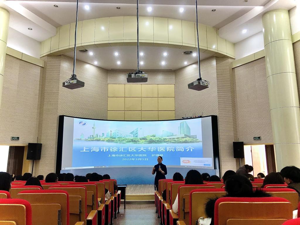 宣讲会上,上海市徐汇区大华医院护理部主任杨雅和实习总带教彭春敏向与会同学介绍了大华医院的基本情况,包括各科室的建设、实习岗位以及人才建设情况。杨雅教授对我校护理学子职业发展和实习就业问题进行指导,并针对学生们的提问进行认真解答。