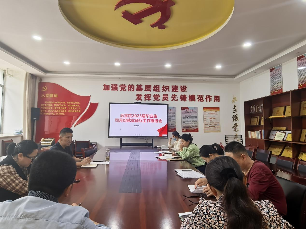 为扎实推进 2025 届毕业生就业及征兵工作,YABO鸭脖于428日在医学楼214党员活动室召开2025届毕业生就业征兵工作推进会。