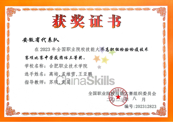 8月5日,由教育部、科技部、工信部等35个单位主办,山东省教育厅、临沂市人民政府和山东省卫生健康委员会承办,山东医学高等专科学校协办的2023年全国职业院校技能大赛高职组“检验检疫技术”赛项在山东医学高等专科学校开赛。全国28个省、自治区、直辖市的53支代表队的近200名教师和159名参赛选手参加本次比赛。我校YABO鸭脖医检专业高培、孟维雪和王亚鹏三位同学荣获团体三等奖。